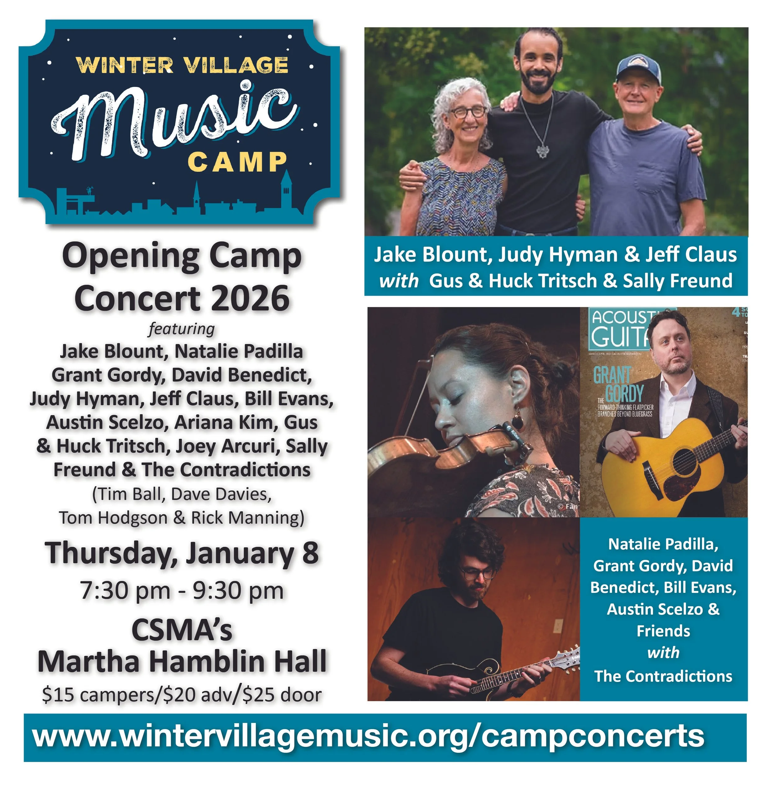 Join us on Thursday evening, January 8th at 7:30 pm as we kick off Winter Village 2026 with Ithaca's own Contradictions (Dave Davies, Tom Hodgson, Tim Ball, Ariana Kim & Rick Manning) playing a few tunes at the beginning of the first set. The first set will continue featuring visiting faculty members Natalie Padilla on fiddle, Grant Gordy on guitar, David Benedict on mandolin, Bill Evans on bass, and Joey Arcuri on bass. Natalie, Grant and David will perform a few tunes on their own then be joined by Austin Scelzo and the Contradictions for a closing tune to end the first set. The second set features multi-instrumentalist Jake Blount with his pals Judy Hyman and Jeff Claus and joined by Gus and Huck Tritsch and Sally Freund.