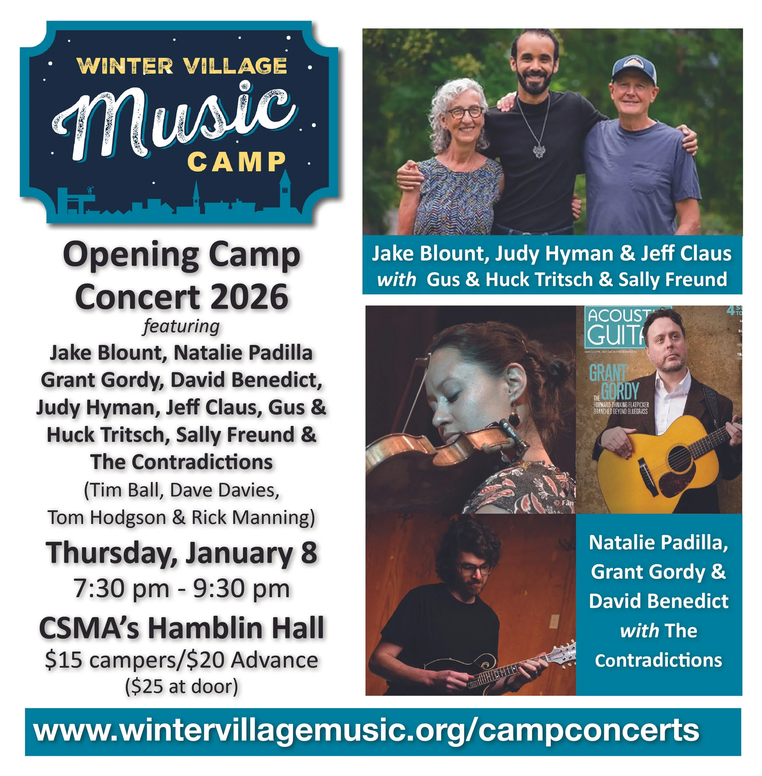 Join us on Thursday evening, January 8th at 7:30 pm as we kick off Winter Village 2026 with Ithaca's own Contradictions (Dave Davies, Tom Hodgson, Tim Ball and Rick Manning) and the joined by visiting faculty members Natalie Padilla, Grant Gordy on guitar and David Benedict on mandolin. Natalie, Grant and David will perform a few tunes on their own as well to end the first set. The second set features multi-instrumentalist Jake Blount with his pals Judy Hyman and Jeff Claus and joined by Gus and Huck Tritsch and Sally Freund. Jake, Gus and Huck all attended Winter Village camps 10 or so years ago and have gone on to be respected progressive old time musicians. We are excited to have them return to perform.